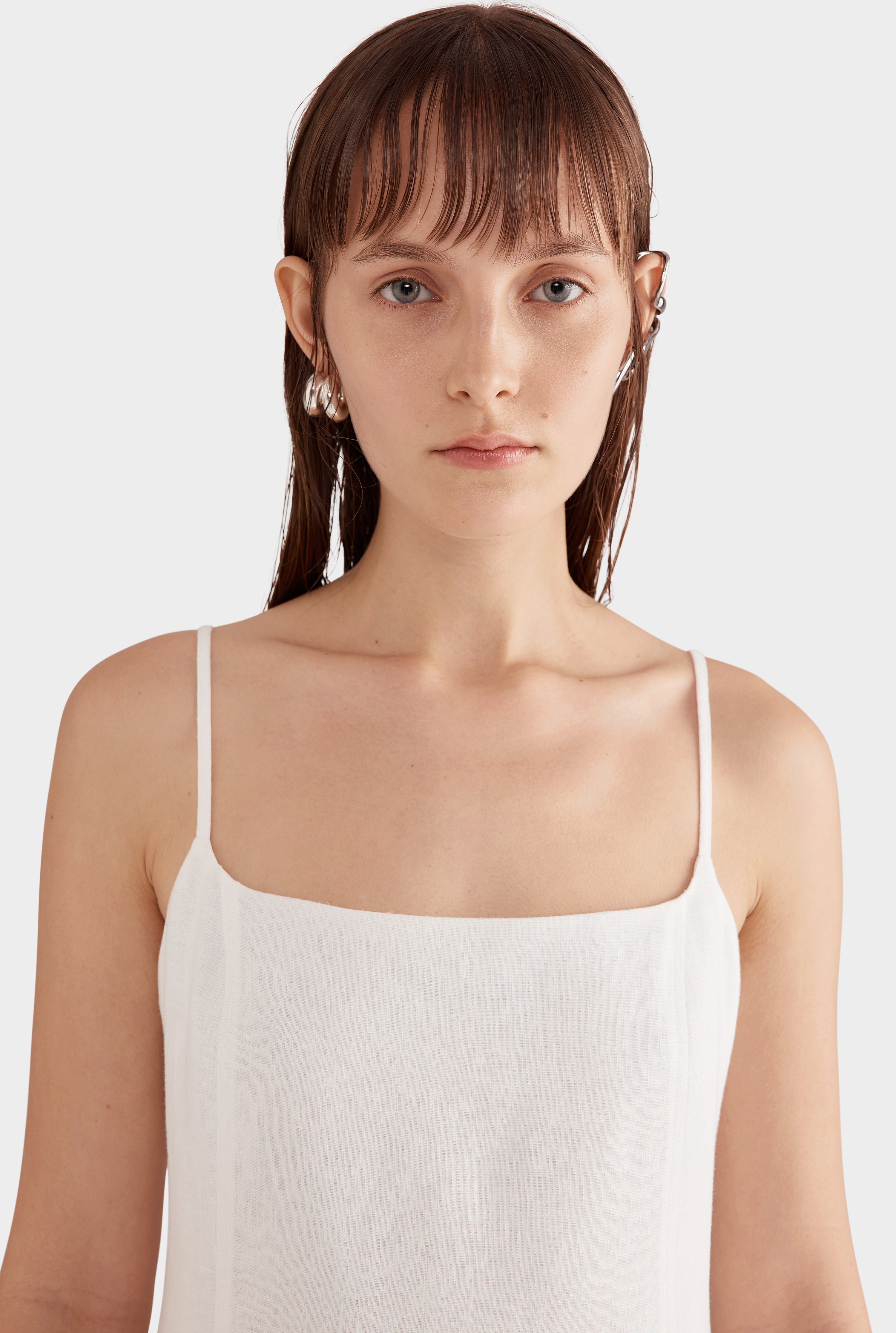 The Linen Panelled Mini Dress in White is made for warmer days. Cut from midweight linen, this mini dress features a fitted silhouette, panelled seam detailing at front, and a straight neckline.