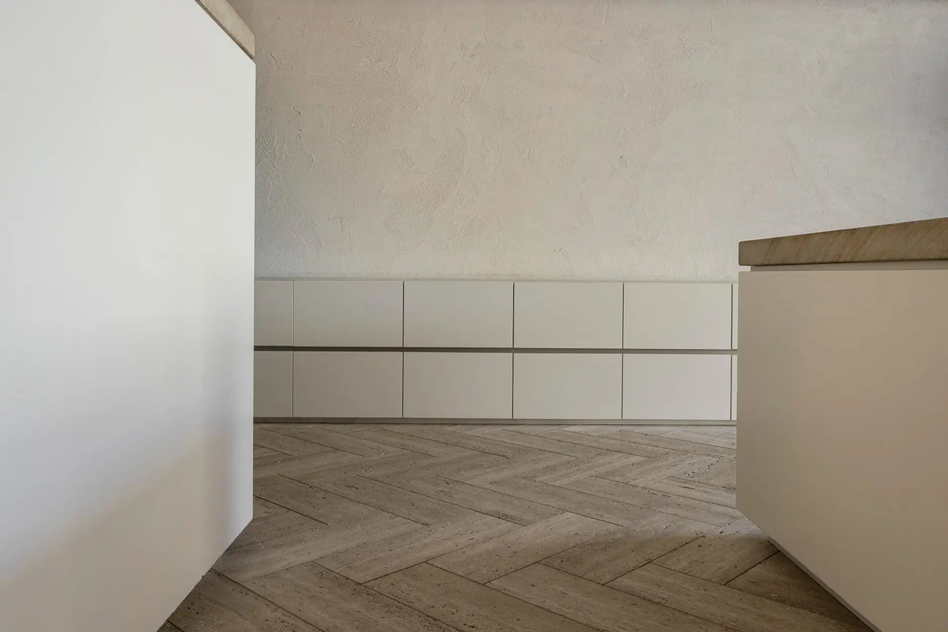 Located in the Intersection’s boutique retail precinct, this Venroy space reflects the leisurely elegance of the inner-Sydney area. Herringbone travertine flooring and a custom-made sandstone counter are complemented by natural sisal carpet. Bespoke brass mirrors glimmer at the rear.