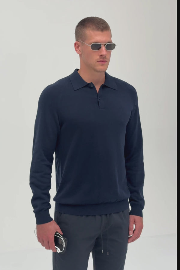 The Long Sleeve Cotton Raglan Knit Polo in Navy is a refined everyday layer. Knitted from soft cotton, it's designed with raglan sleeves, fully fashioned armholes, and a two-button placket. Finished with ribbed cuffs and a ribbed hem, it's a versatile piece that works with everything from tailoring to denim.